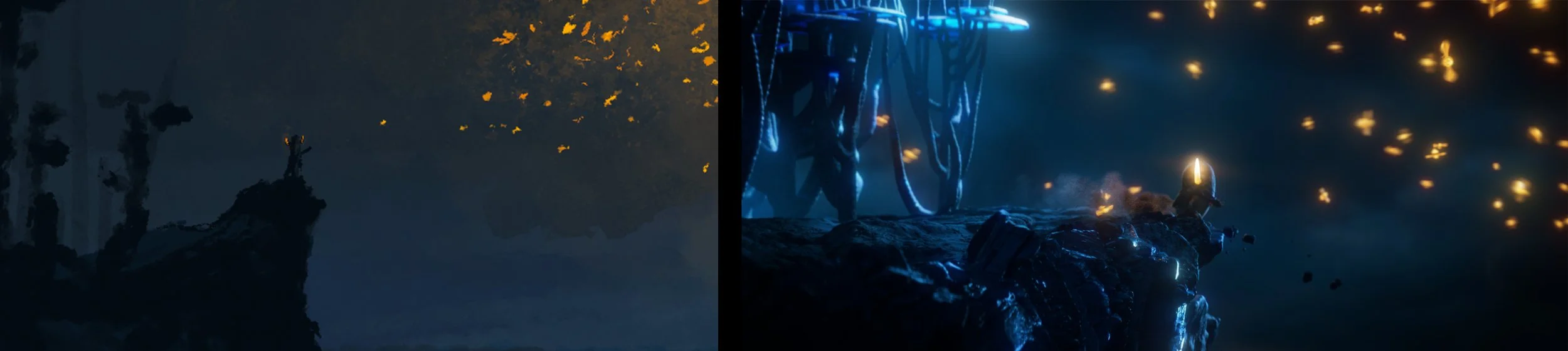 Throughout this process of lighting, I am constantly referring back to the color script that I created back at the start of the project. In each shot, every scene, I aim to keep a sense of continuity in how the light changes and reflects the mood throughout the film. Below, you can see two examples of the color script that I started with, and where the final shots ended up.