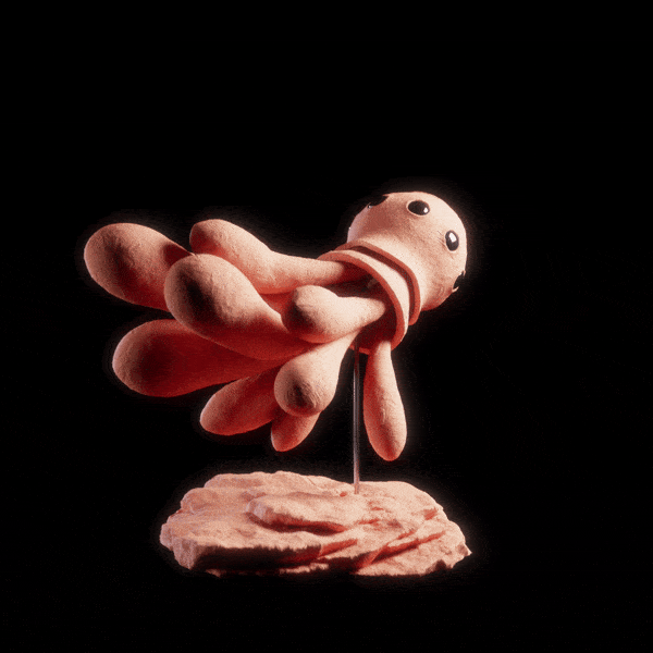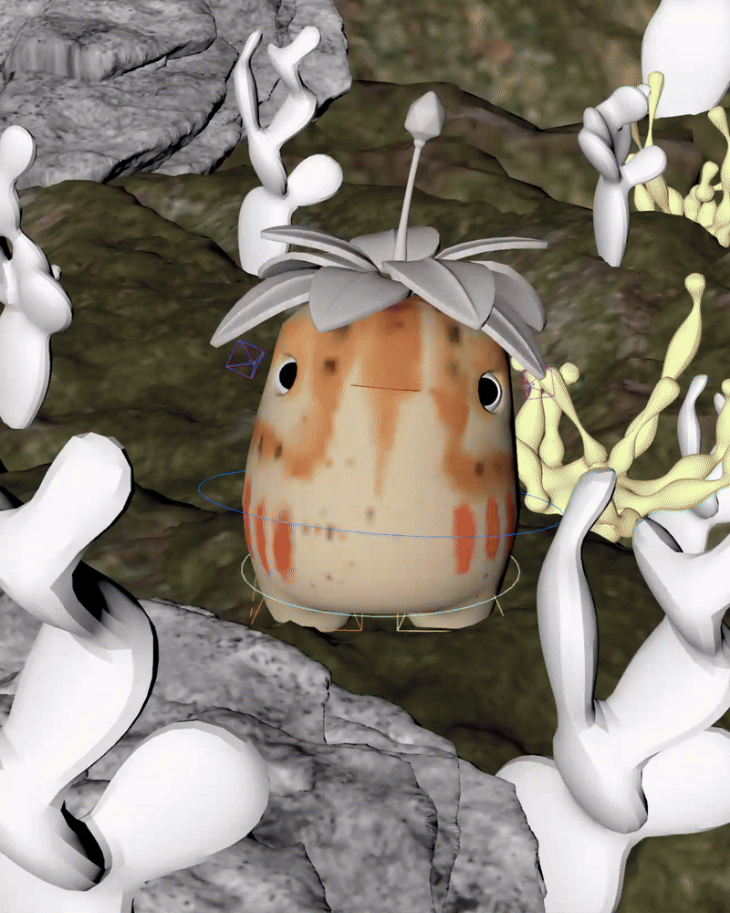 This realization about using simulation to drive a lot of the complex motion became the central tenet of all of my designs for characters in this piece. The tree climbers would have leaves and little bobbles on their heads that would be simulated as they moved around. They also live in the ground and climb trees with their little grappling hooks, so they clearly don't need arms, right? One less thing to animate. The birds could fly like helicopters, giving them an alien quality, unique and novel, while still simplifying the animation. Animating a single rotation axis for their wings is a lot simpler than animating multi-chained joints for a typical organic wing motion. The swimmers continued with this same ideology - over half of their bodies are tentacles that have no animation at all, only a tetrahedralized soft body simulation after their bodies are animated in each scene.